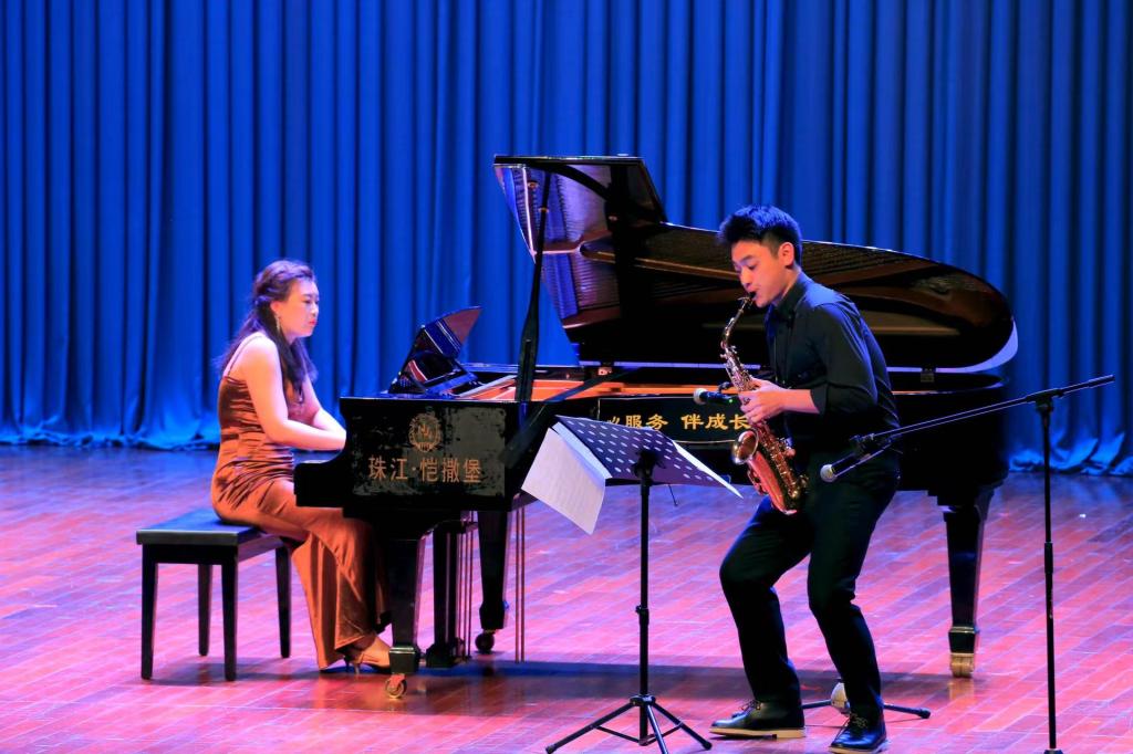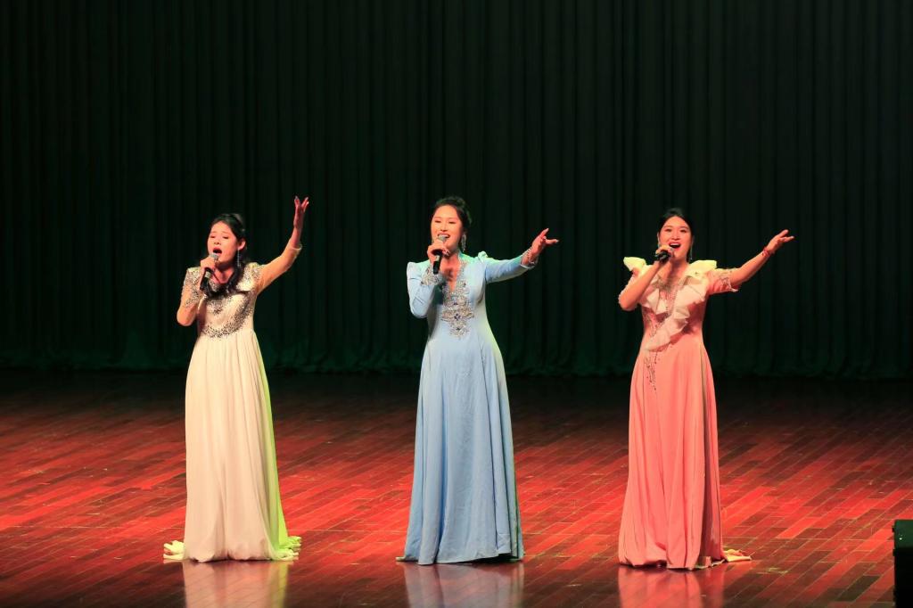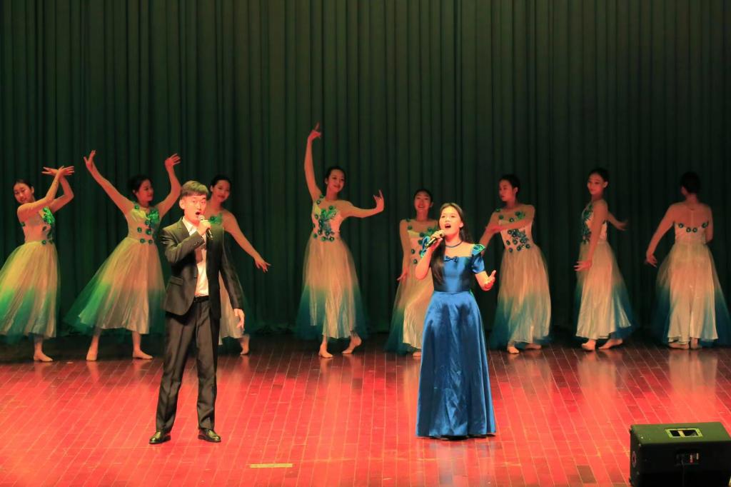 由张欣漪、王路敏、吴伊颖三位老师演唱的《在希望的田野上》拉开了整场演出的序幕,歌颂了改革开放以后的新变化、新面貌,展现了对幸福未来的憧憬。王琳带来的女声独唱《踏歌起舞》,歌曲大气磅礴,高音宛转漂亮、荡气回肠,以深情为主调赞美祖国、歌唱家乡,向观众充分地描绘出祖国幸福美好的新生活,让观众内心澎湃。萨克斯与钢琴合奏的《主题与幻想》作为历史上第一首幻想曲,意大利歌剧的风格让观众耳目一新。二重唱《灯火里的中国》把满满的祝福和无限的激情洒满每一个角落,让观众忍不住跟着轻哼。