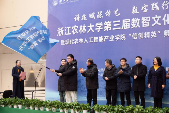 孵化营导师汪其顺、陈梁为学员代表授营旗、赠书,首届现代农林人工智能产业学院“信创精英”孵化营正式启动。