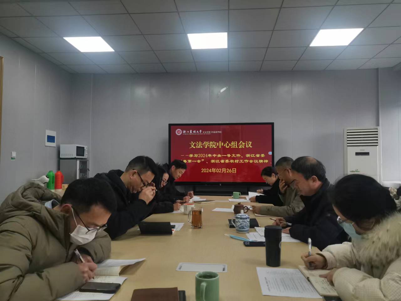 2月26日下午,文法学院召开中心组学习会,专题学习2024年中央一号文件精神,学习浙江省委“新春第一会”及农村工作会议精神。中心组成员参加学习,党委书记朱红东主持学习会。