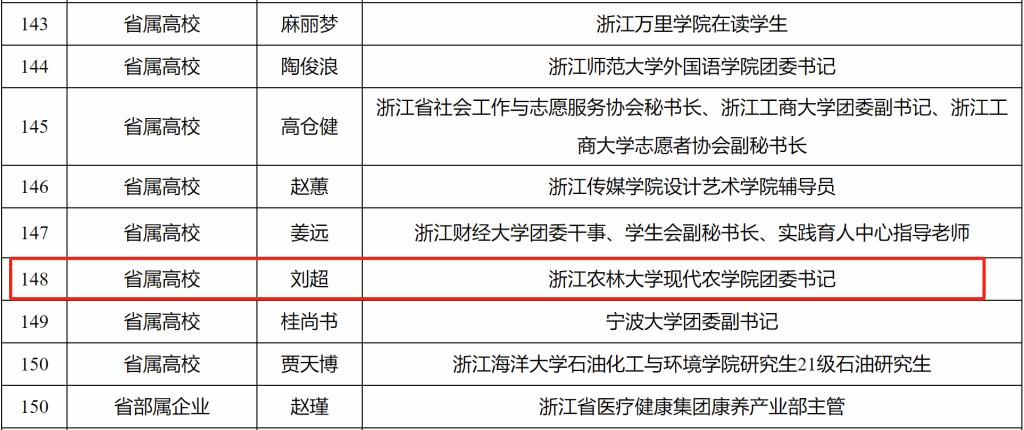 荣获突出贡献个人荣誉称号的刘超老师,现任校团委委员、现代农学院团委书记,杭州亚运会、亚残运会志愿者培训师和志愿者领队教师,中央团校2023年度基层组织团干部进修班(第6期)学员。曾任“韵味杭州”2023年全国U17国际式摔跤锦标赛、2023年杭州临安半程马拉松等赛事志愿者领队教师,他积极奉献、尽心尽责,累计志愿服务总时数达1200小时。