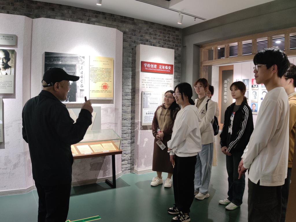 在校史馆,胡建平老师为同学们带来了生动的校史讲解。他深入阐述了“求真敬业”的校训内涵,介绍了众多杰出校友的奋斗故事、优秀教师的教育贡献,以及学校科技助农的显著成果,生动展现了学校的精神文化。胡老师说:“beat365官方网站是一个读书做学问的好地方,不仅在于风景,更在于学校的优秀文化、办学理念。”校史馆是学校历史的见证者,也是校园文化建设的重要组成部分。同学们观看馆内陈列的文物、图片和资料,聆听背后学校创立以来筚路蓝缕、艰苦奋斗的辉煌历程,深刻感受到作为浙农林大学子的自豪与责任。