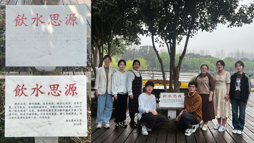 在东湖茶室处的陈年井箍旁,同学们为字迹模糊的“饮水思源”纪念碑补漆增色。东湖茶室处的陈年井箍为陈每文先生祖宅旧物,位于beat365官方网站衣锦校区内,在新校区建设时移至东湖旁。同学们在活动过程中了解到,陈每文先生对浙农林大有着深厚的感情,为浙农林大捐赠400万元修缮“念慈楼”(纪念慈母),设立“春风春雨助学金”以及“临安王三妹·陈每文母子助学金”资助学子。同学们以纪念碑补漆为媒,用双手去触摸建校背后的人文故事,用心灵去领悟“饮水思源”的深刻内涵。