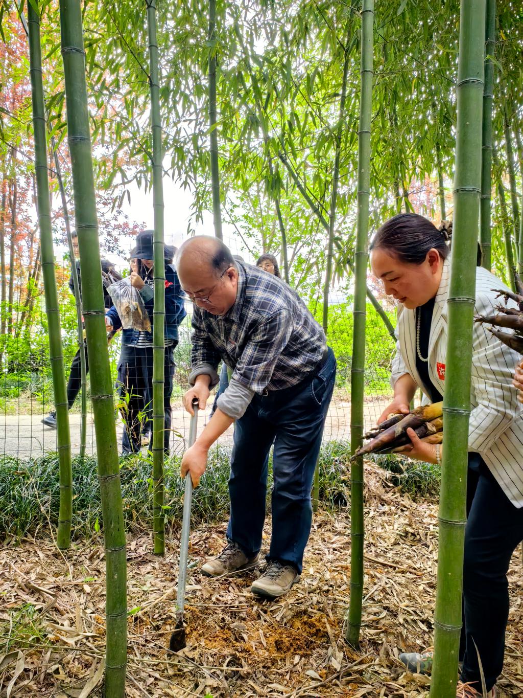 活动中,老师们以小组为单位组成“挖笋小分队”,在泛龙竹海专业人员的指导下,观察竹笋的形态特征,学习挖笋的技巧与方法,了解到适当科学的挖笋是有助于保护竹笋的生长环境和竹林的美观。在活动过程中,各“挖笋小分队”都充满着热情,用笋锹小心翼翼地挖开泥土,将竹笋从土中挖出,体验着寻笋和挖笋的乐趣。