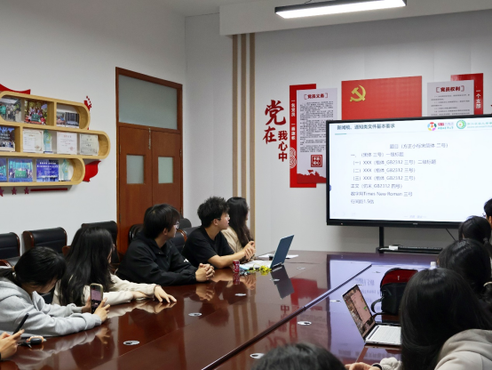 第二个环节,学生会执行主席朱雨洁对学生会近期工作进行部署,对学生会工作人员的业务能力进行培训。主要从办公软件使用、办文办会注意事项、社会实践落实要点、通讯新闻稿撰写、公众号排版技巧等方面进行培训。