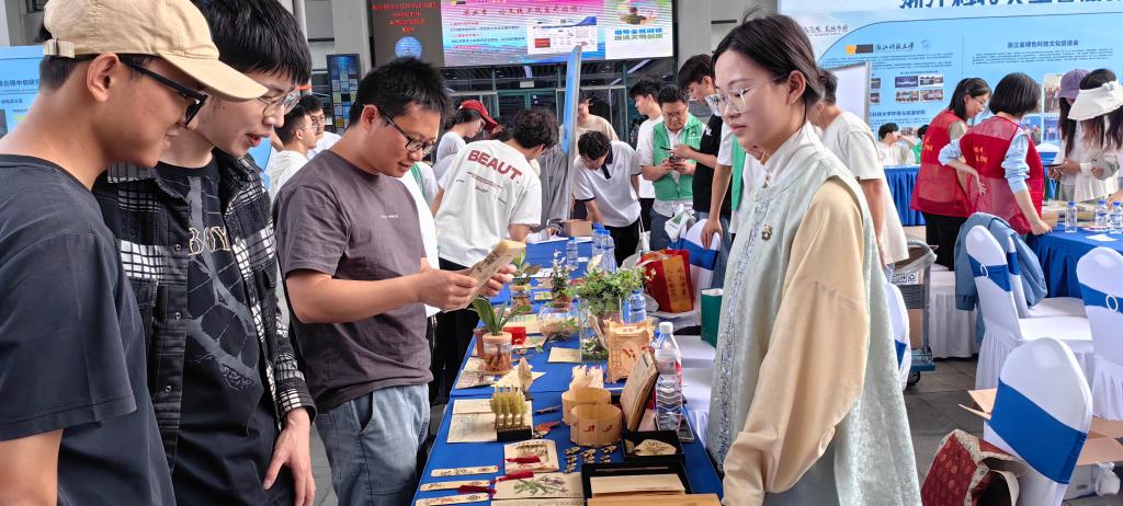 新绿地土壤协会展示了社团成员手工制作的精美生态缸以及多种空气净化能力较强的植物样本和室内植物盆栽;竹木文创设计与制作协会展示了通过刨切微薄竹技术制作的录取通知书、竹书《大学》、竹制书签、小熊猫徽章等30多样展品。