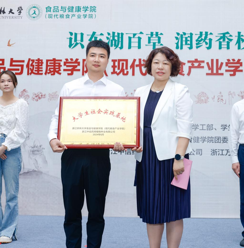 闵伟红为浙江中信药用植物种业有限公司颁发大学生社会实践基地铜牌,台上领导、嘉宾共同为学生代表赠送《黄帝内经》《神农本草经》等中药经典书籍。