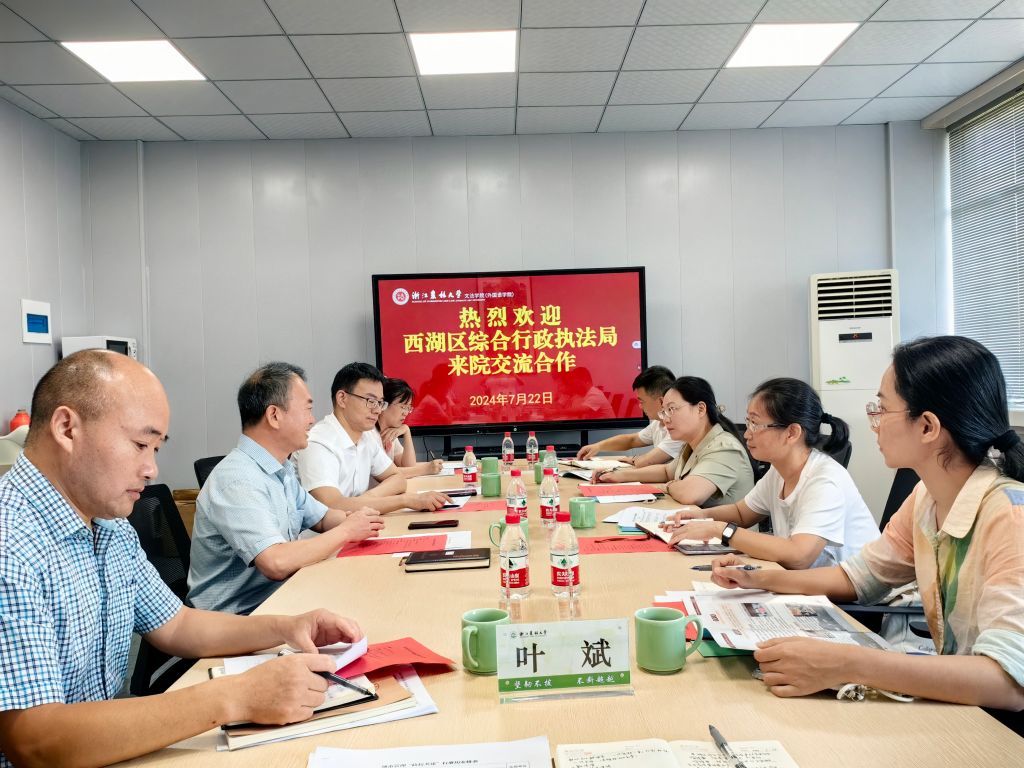 7月22日,西湖区综合行政执法局办公室副主任徐锦霞、 品效管控中心主任徐春霞、蒋村中队副队长余杰等一行4人到文法学院交流合作事宜。文法学院党委书记朱红东及相关负责人和相关学科负责人参加座谈。