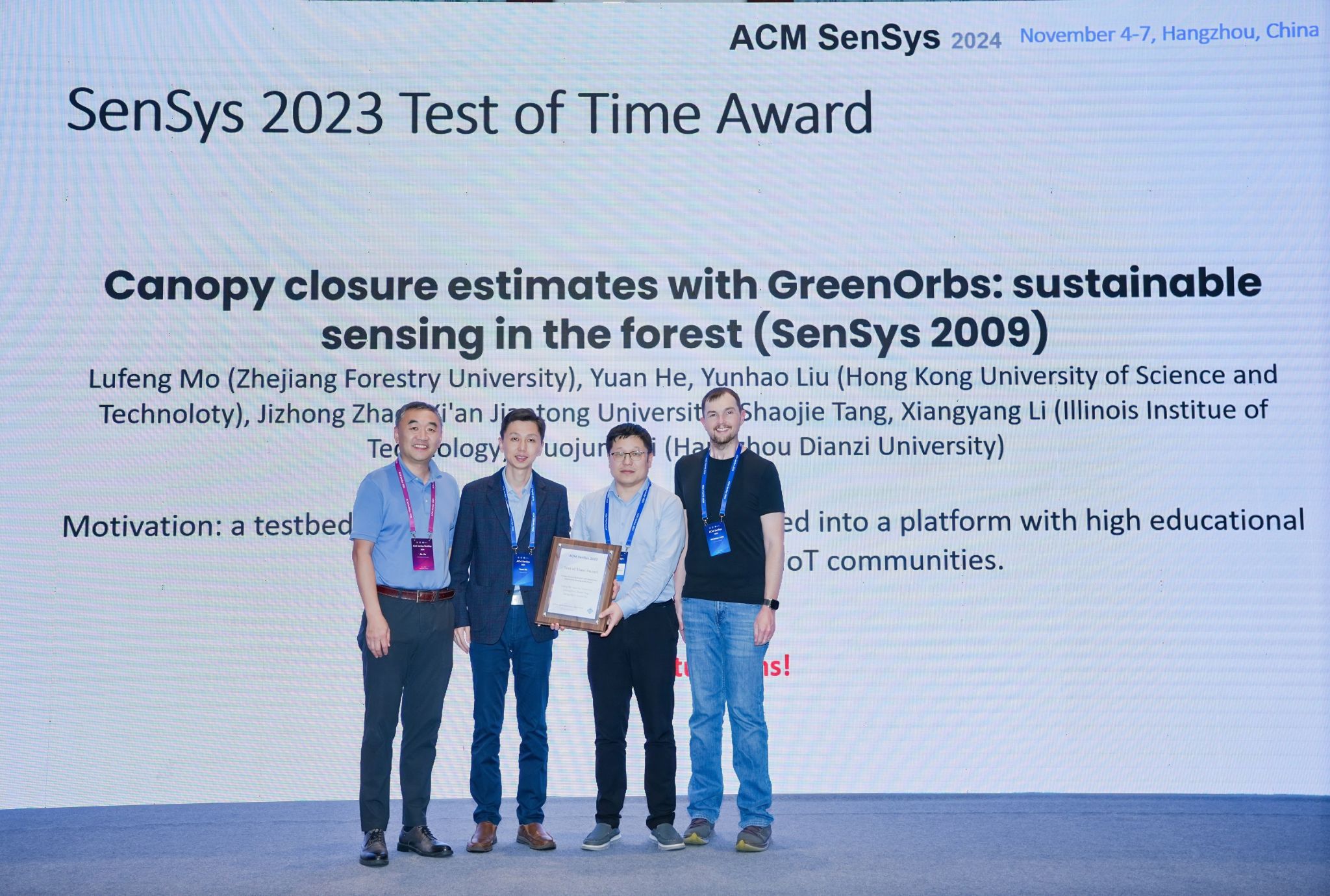 近日,由beat365官网莫路锋老师和香港科技大学、西安交通大学、伊利诺伊理工学院、杭州电子科技大学研究人员联合署名,发表在The 7th ACM Conference on Embedded Networked Sensor Systems (SenSys 2009)上的论文《Canopy Closure Estimates with GreenOrbs: Sustainable Sensing in the Forest》(《利用GreenOrbs进行林冠郁闭度估算:森林中的可持续监测》)获得ACM SenSys 2023 经久不衰奖(Test of Time Award)。