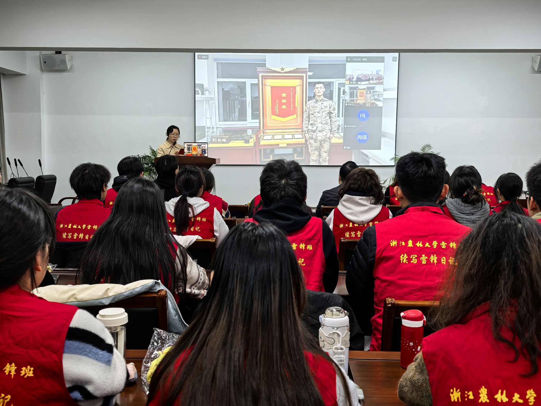 雷锋班第27任班长牟振华中士,2019年参加中华人民共和国成立70周年国庆阅兵任务,先后获得全国优秀共青团干部、陆军“优秀士官标兵”“学雷锋标兵”等多项荣誉,荣立二等功1次,获嘉奖多次,是学雷锋的先锋模范人物,在社会上起到了极好的模范带头作用。通过视频连线,牟振华中士带领全体与会人员参观了雷锋班和雷锋连的荣誉室,牟中士详细介绍了雷锋生平事迹和各种充满故事的物件等,展示了这些年雷锋班和雷锋连在学习和传承雷锋精神的征程上取得的累累硕果。随后牟中士作专题讲座,结合一个个生动的雷锋生前故事,深入探讨、系统讲解了雷锋精神的当代实践。