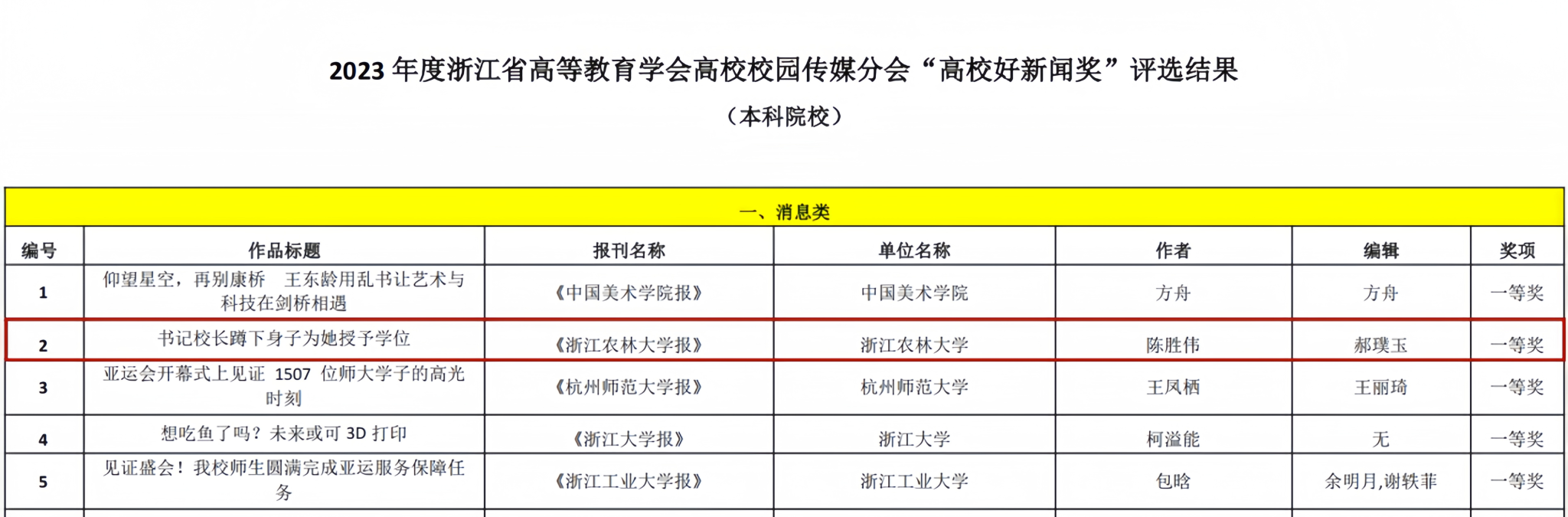 2023年度,beat365官网共有四件新闻作品获奖。其中《书记校长蹲下身子为她授予学位》获消息类一等奖,《beat365官方网站报》2023年10月31日第697期第02.03版、2023年12月31日第699期第04版、2023年12月31日第699期第03版分别获版面类三等奖。