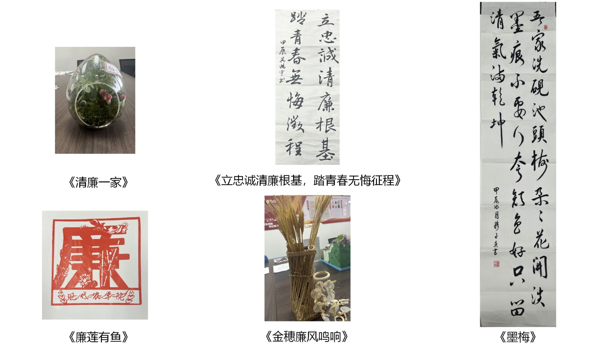 本次大赛以“清风扬正气,廉洁促发展”为主题,鼓励广大同学立足农学院实际,结合学科专业特色,深入挖掘作物、植物、昆虫等的廉洁文化元素,讲述身边的廉洁故事,宣传廉洁理念,传播廉洁文化。共收到手工、海报、征文、书法等各类作品30余件。最终评选出特等奖1名、一等奖5名、二等奖10名、三等奖12名。