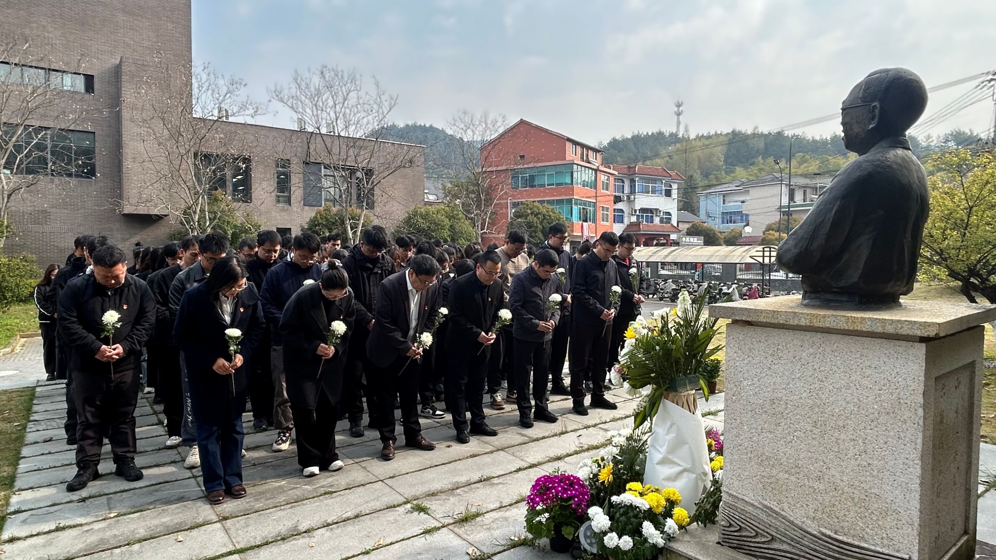 活动现场,全体人员手持素雅白菊,面向塑像静默肃立。在追忆环节,林业工程研究生党支部党员李雨欣动情回忆张齐生院士生平事迹,从破解“以竹代木”的产业密码,到构建现代竹材工业体系;从培育硕博英才的教育坚守,到笔耕不辍的师者仁心。张齐生院士用一生诠释了教育家精神和科学家精神的丰富内容,激励广大师生砥砺奋进。