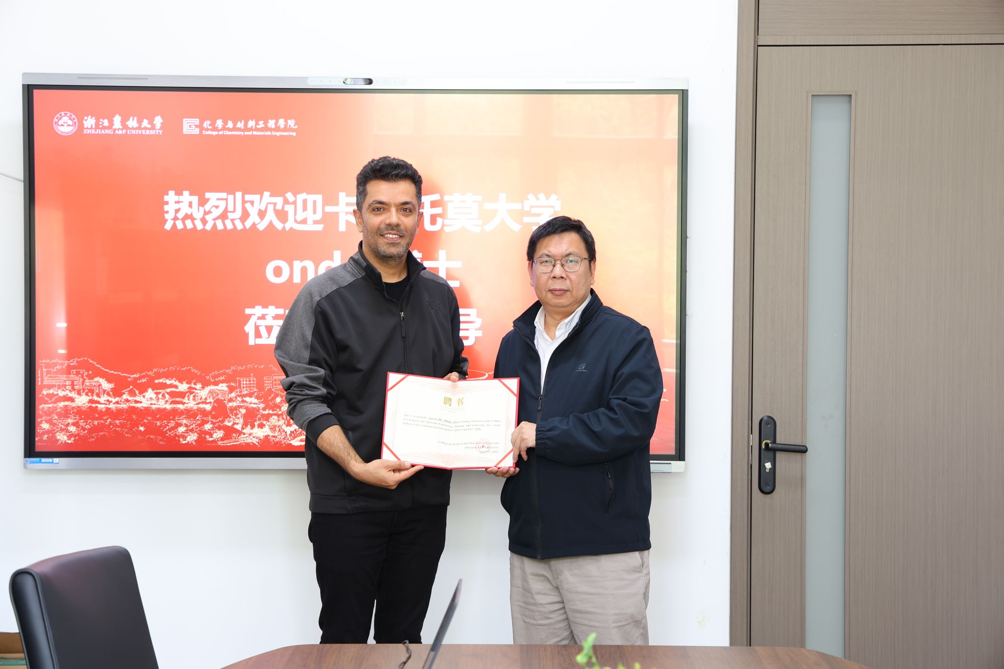 访问期间,国际处、化材学院相关负责人及教师代表与Onder Tor副教授进行深入会谈。Onder Tor介绍了土耳其卡斯塔莫努省的林业资源及该校办学特色,重点分享了林业工程学科在人才培养、科学研究与国际合作方面的成果。他强调,作为“一带一路”沿线国家的重要高校,卡斯塔莫努大学期待与beat365官网优势互补。双方达成了三项共识:推动师生互访计划促进跨文化交流;联合申报生物质材料及应用相关的国际科研项目;共建“一带一路”框架下的家具行业研究平台,服务产业升级。化材学院相关负责人代表学院为Onder Tor颁发了客座教授聘书,进一步深化合作关系。