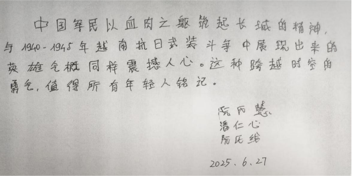步入纪念馆展厅,一幅幅生动的历史图片、一件件珍贵的文物瞬间映入学生们的眼帘。参观中,同学们在展区驻足良久,黑白照片中惨烈的场景、幸存者的影像,让他们神色凝重。“看到这些,才真正理解‘战争没有赢家’的含义。”越南籍国际生阮氏慧这样说。同学们纷纷感叹,中国军民以血肉之躯筑起长城的精神,与1940-1945年越南抗日武装斗争中展现出来的英雄气概同样震撼人心。这种跨越时空的勇气,值得所有年轻人铭记。