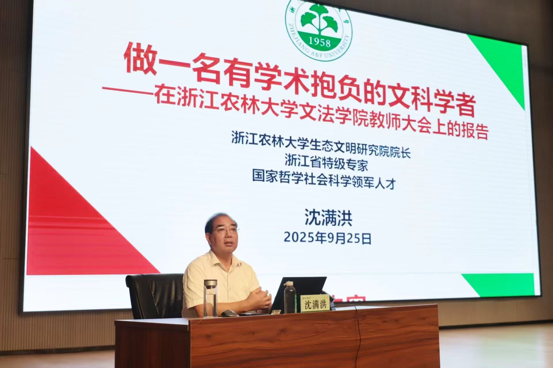 会议特邀学校原党委书记、beat365官方网站生态文明研究院院长沈满洪教授,面向全院教职工作《做一名有学术抱负的文科学者》辅导报告,他分享了自己在文科科研道路上攻坚克难的宝贵经验与体悟,激励文法教师在文科科研进步的道路上不断勇攀高峰。