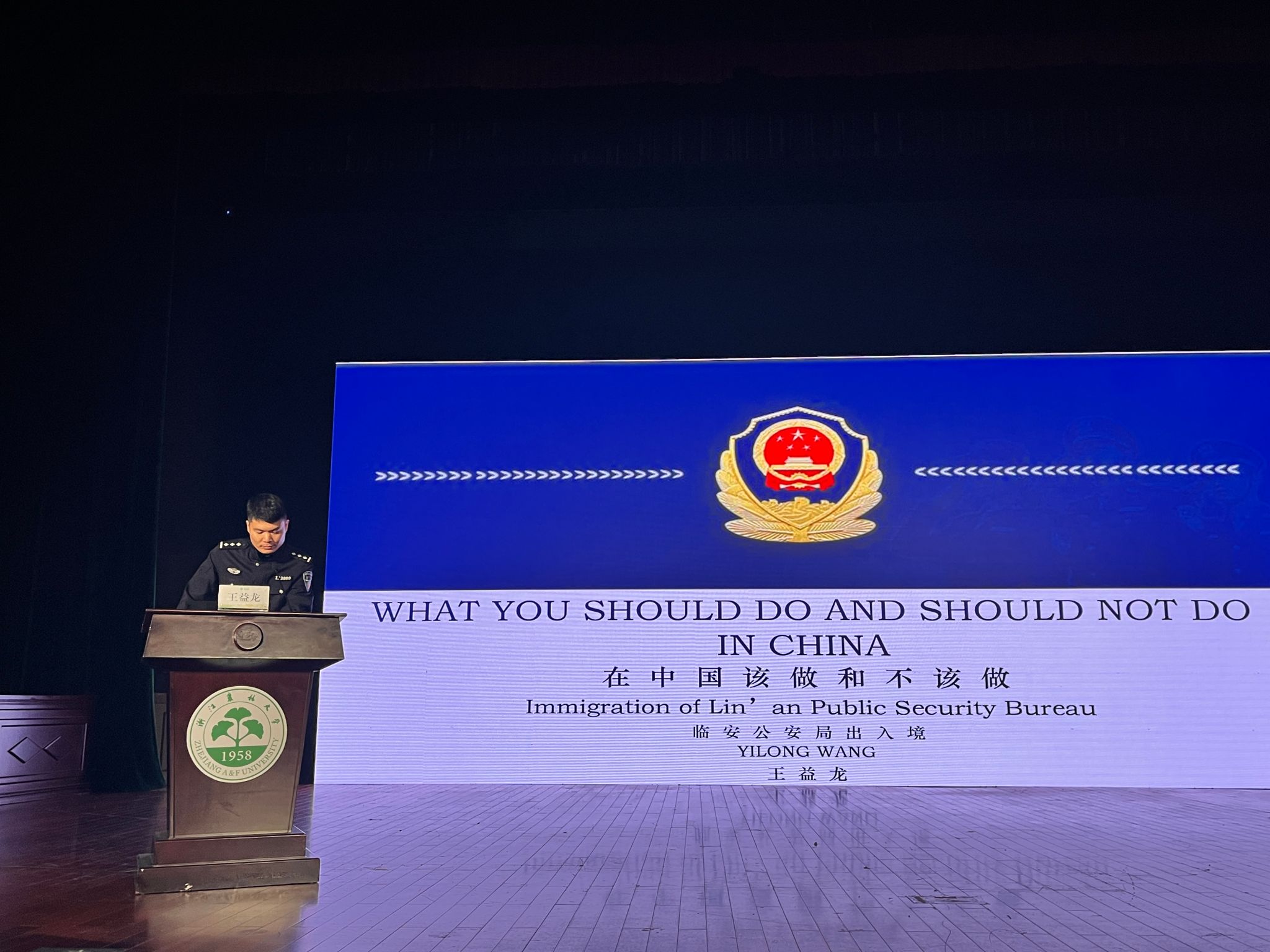 随后,赵有华和学院校外辅导员、临安区公安局出入境管理科王益龙警官分别为全体国际学生作法制安全教育专题讲座,围绕禁毒知识、出入境管理规定、交通安全、治安防范、电信网络诈骗识别与预防、宗教活动法律法规等重点领域,借助典型案例开展以案释法,深入浅出地开展警示教育。