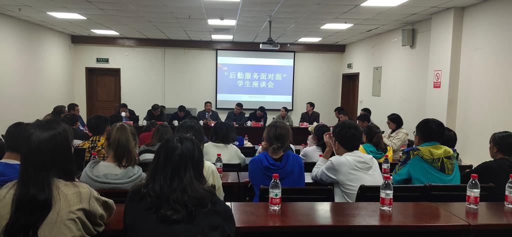 校学工部、教务处、公管处、保卫处、校团委、图书馆、后勤中心等相关部门领导出席会议。后勤中心安质部、公寓中心、物业中心、餐饮中心、商贸中心、文教中心、修建中心、卫保中心等相关部门负责人、各学院学生代表等50余人参加座谈。
