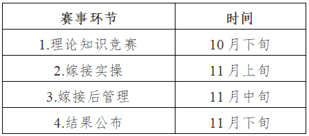 考核说明:嫁接所需的接穗和砧木幼苗由组委会提供;参赛选手在成果展示前完成视频制作。嫁接技能竞赛顺序由组织方经抽签确定,参赛选手须按规定时间参赛,迟到15分钟视为弃权。