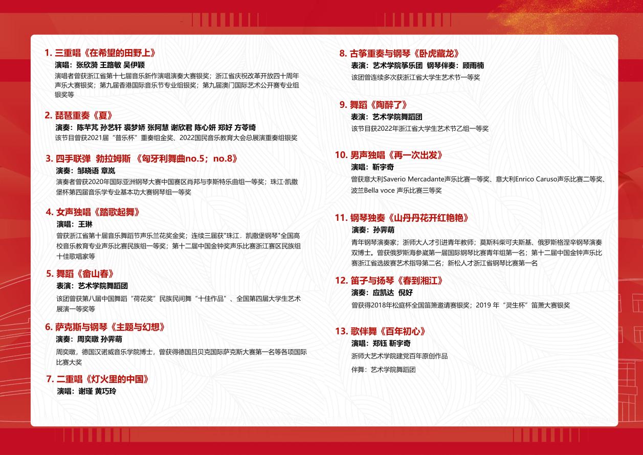 浙江师范大学是一所以教师教育为特色的综合性省属重点大学,坚持中国特色社会主义办学方向和立德树人根本任务,以“提升质量、提升特色、提升效益”为主线,秉承“砺学砺行、维实维新”校训精神,重视美育教育。浙江省大学生艺术团是在省教育厅领导下,面向全省大学生的艺术团体。艺术团设总团和分团,浙江师范大学分团是首批设立的6个分团之一。浙江师范大学艺术团全力提升校园文化艺术品位,贯彻落实上级有关要求,统筹组织安排学生参与、开展各级各类学生艺术活动,把握每次参与机会,广泛动员、精心组织、力推精品。学生屡次在国际舞台上展现风采,连续受孔子学院总部、国家汉办委派,先后赴美国、加拿大等10个国家开展中国文化大巡演,登上“中国—东盟艺术教育成果展演”国际舞台,并参加省运会等大型活动演出。本场演出所选均为历年来获奖团队、获奖作品,参演青年教师多次获国际大奖。