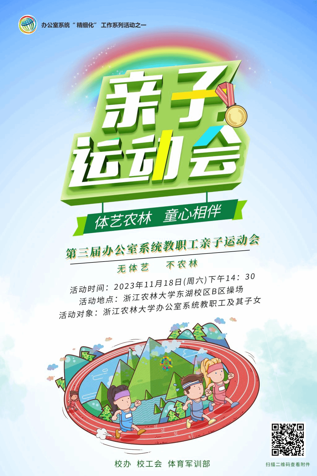 为践行“无体艺 不农林”理念,牢固树立“体艺育人,终身受益”的思想,着力提升办公室系统的凝聚力,进一步加强教职工家长与孩子之间的沟通交流,丰富教职工的业余生活。经研究,学校办公室、校工会和体军部联合举办“体艺农林 童心相伴”——beat365官方网站办公室系统第三届亲子运动会,以切实增强全校办公室系统人员的责任感、归属感和幸福感。