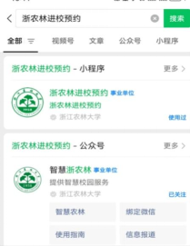 1.入口:1)微信搜“浙农林进校预约”;2)公众号搜“智慧浙农林”-微应用-进校预约。