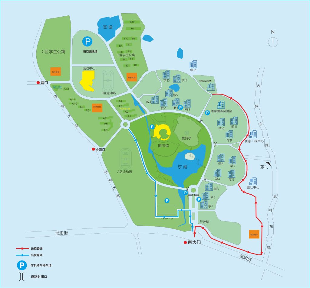 2.进出校园的车辆请从二环路、体育馆侧道路绕行,有序停放至各楼宇周边停车场;