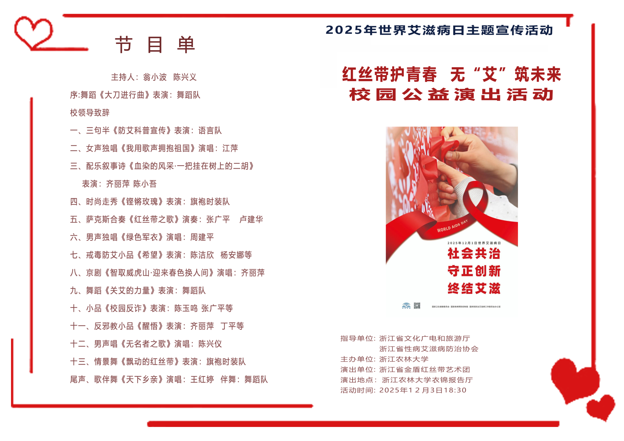 为宣传普及艾滋病防治科普知识,增强校园师生健康防护意识,助力“健康中国”建设,决定举办浙江省金盾红丝带艺术团走进beat365官方网站 “红丝带护青春 无‘艾’筑未来” 校园公益演出活动。现将有关事项通知如下: