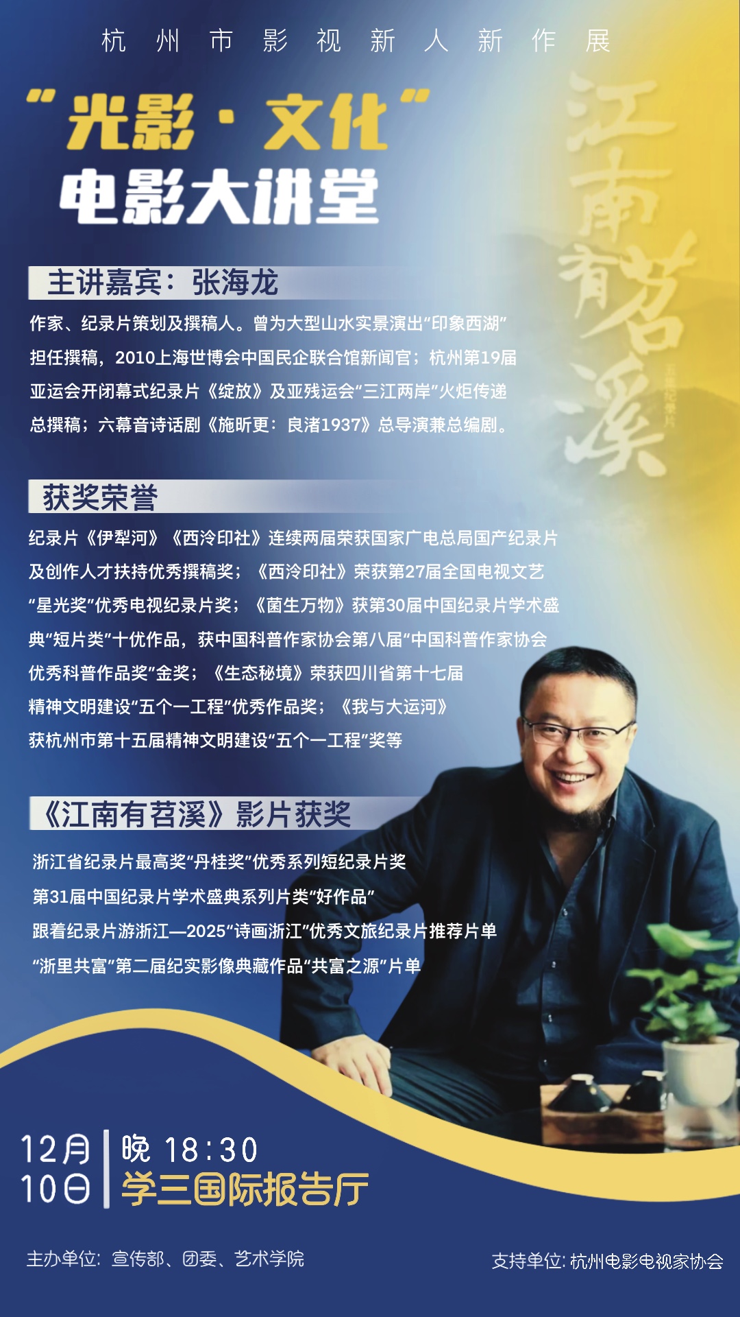为了深入贯彻学校“无体艺 不农林”的战略要求,丰富学生校园文化生活,促进艺术交流与学习,beat365官方网站党委宣传部、校团委、艺术设计学院联合举办“光影·文化”电影大讲堂活动。本次电影大讲堂是“杭州市电影新人新作展”特别展映活动之一,旨在发现、扶持、团结、引领青年优秀影像创作者,激活杭州影视创作活力,推动杭州影视内容高质量发展。活动特邀著名作家、纪录片策划及撰稿人张海龙先生担任主讲嘉宾,分享其艺术创作经验与心得,与师生探讨影像艺术魅力。