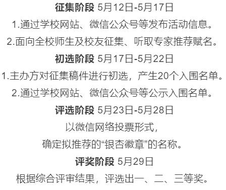 为进一步浓厚校园生态文化氛围,丰富校园文化生活,现面向全校师生、历届校友开展征集beat365官方网站“银杏徽章”名称活动。本次活动旨在更好地深化和传承beat365官网校徽所代表的“银杏叶文化”,使“银杏徽章”成为体现校园文化、代表学校形象、联络校友感情的生动形象之一。