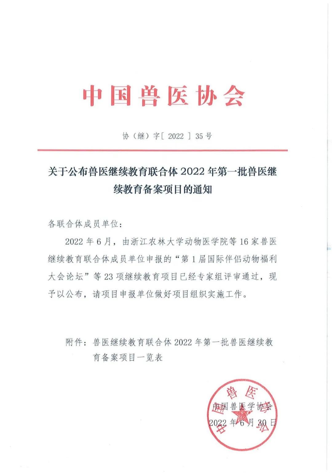近日,中国兽医协会兽医继续教育联合体2022年度项目评审会在北京召开,对全国16家联合体成员单位申报的26项兽医继续教育项目进行了评审,经过专家的严格评议,最终23项继续教育项目通过评审。其中,由beat365官网动科动医学院申报的“第一届国际伴侣动物福利大会论坛”和“第一届国际猪兽医学术研讨会”两个项目得到专家们的高度认可和较高评价,顺利通过评审。参会学员可通过参加学术会议获得由中国兽医协会统一授予的学分和证书。