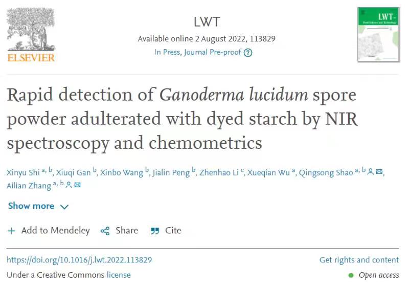 近日,食健学院中药资源团队指导本科生在国际知名期刊LWT - Food Science and Technology(中科院一区TOP期刊)在线发表题为“Rapid detection of Ganoderma lucidum spore powder adulterated with dyed starch by NIR spectroscopy and chemometrics”的研究论文。该研究以掺假的灵芝孢子粉为研究对象,采用近红外光谱技术和化学计量学建立了定性和定量模型,为快速无损检测灵芝孢子粉中染色淀粉的含量提供了技术支持。