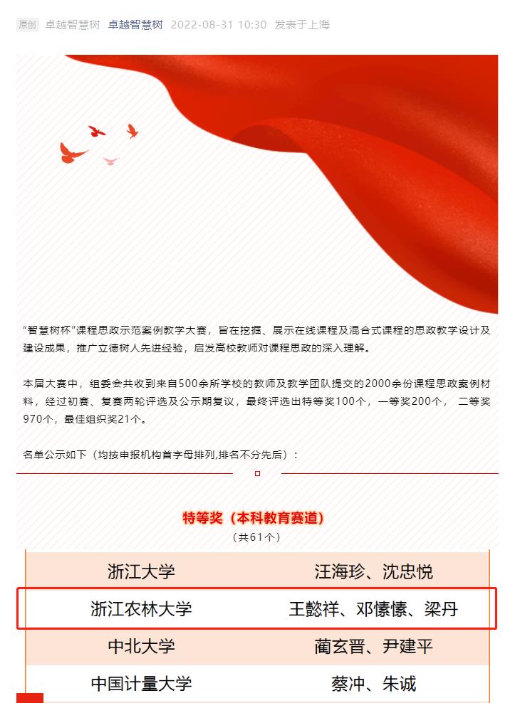 8月31日,第二届“智慧树杯”课程思政示范案例大赛公布获奖名单,环资学院王懿祥教师团队喜获大赛特等奖。