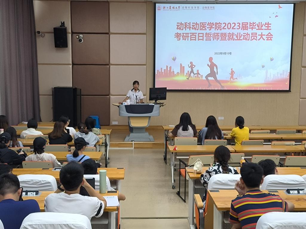 9月15日,动科动医学院在学2201召开2023届毕业生考研百日誓师暨就业动员大会,鼓励同学们为人生新征途作最正确的选择。学院党委书记苏小菱出席会议并作誓师动员讲话,辅导员和全体2023届毕业生参加会议。