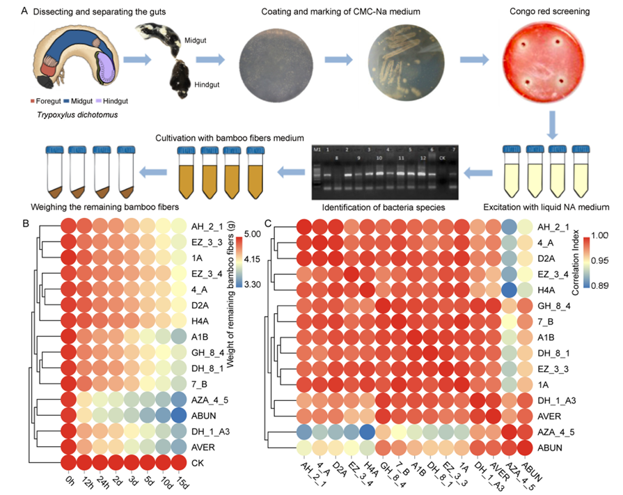 在此基础上,课题组还分离筛选得到31个具有纤维素降解功能的菌株。采用其中13个功能更强的菌株,人工构建了混合菌系,发现其中肠杆菌属菌株AZA_4_5和自然菌系对竹纤维的表现出更高的降解效率。这些研究结果为后续继续深入研究双叉犀金龟对木质纤维素的降解机制,以及最大化功能菌群的纤维素降解能力奠定了基础。