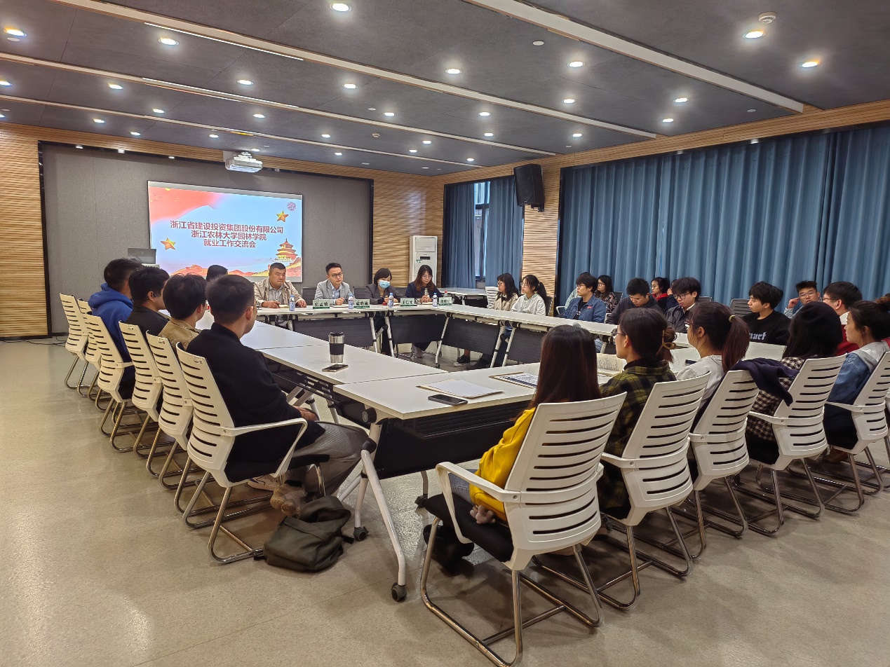 近日,园林学院与浙江省建筑投资股份有限公司共同举办2023届毕业生就业工作交流会,浙建集团党委组织(人力资源)部招聘主管施晓海,浙江一建三分公司党总支副书记、工会主席、副经理王巳元,浙江一建党委组织(人力资源)部经理助理胡晓甜参加此次座谈会。