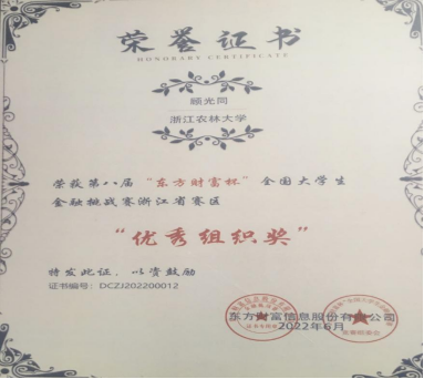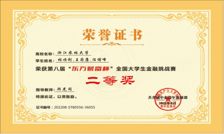 第八届东方财富杯全国大学生金融精英挑战赛全国决赛于2022年4月25日-7月29日举行。beat365官网学子荣获国家级二等奖1项和省级一、二、三等奖19项。其中:金融工程专业2020级林顺利、王府康、任博峰同学荣获国家二等奖。beat365官网还荣获浙江省赛区“优秀组织奖”。
