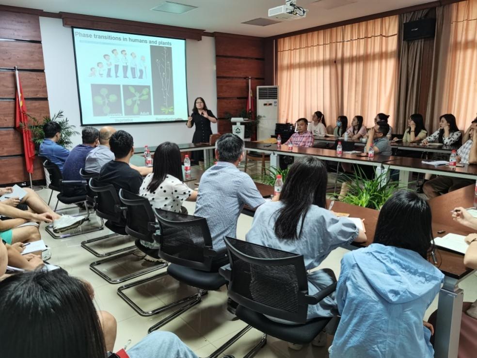 许明丽围绕表观遗传调控植物营养生长阶段转变的分子机制与在场师生进行研究交流。她从植物营养生长阶段转变的组蛋白甲基化和乙酰化调控、弱光条件下植物幼年向成年转变的机理以及植物叶型发育的年龄调控机制等方面,深入浅出地讲述了其多年来在植物幼年向成年转变调控过程中的科研探索历程。
