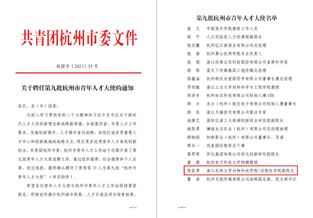 7月,共青团杭州市委发布了《关于聘任第九批杭州市青年人才大使的通知》。经过选拔,最终确认聘任第九批35名“杭州市青年人才大使”,其中动科动医学院程昌勇教授入选这一殊荣(临安区共2名青年人才入选)。