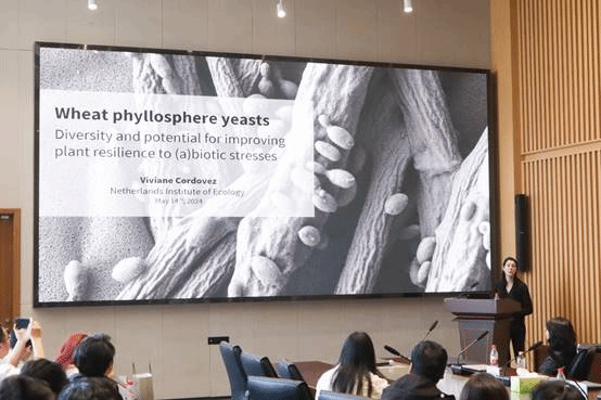 Eiko教授介绍了其科研团队概括,并就气候变化等影响下的微生物群落的转变分享了她团队的最新研究成果;Viviane教授作了题为“小麦叶际酵母的多样性和提高植物对(非)生物胁迫的适应能力的潜力(Wheat phyllosphere yeasts-Diversity and potential for improving plant resilience to (a)biotic stresses)”的精彩讲座,报告围绕小麦叶际酵母菌的分离鉴定及其对不同胁迫的响应展开,详细阐释了叶际酵母菌对水稻在抗胁迫方面的影响;Ohana博士后作了题为“土壤中芽胞杆菌胞外多糖同化过程中活性细菌和真菌相互作用的动态(Dynamics of active bacterial and fungal interactions in the assimilation ofacidobacterial EPS in soil)”的精彩报告,讲座围绕微生物胞外多糖积累、生物膜形成和土壤团聚体结构展开,详细分享了利用多组学技术手段对真菌与细菌互作的研究。与会师生围绕报告内容与报告人开展了深入的交流探讨。