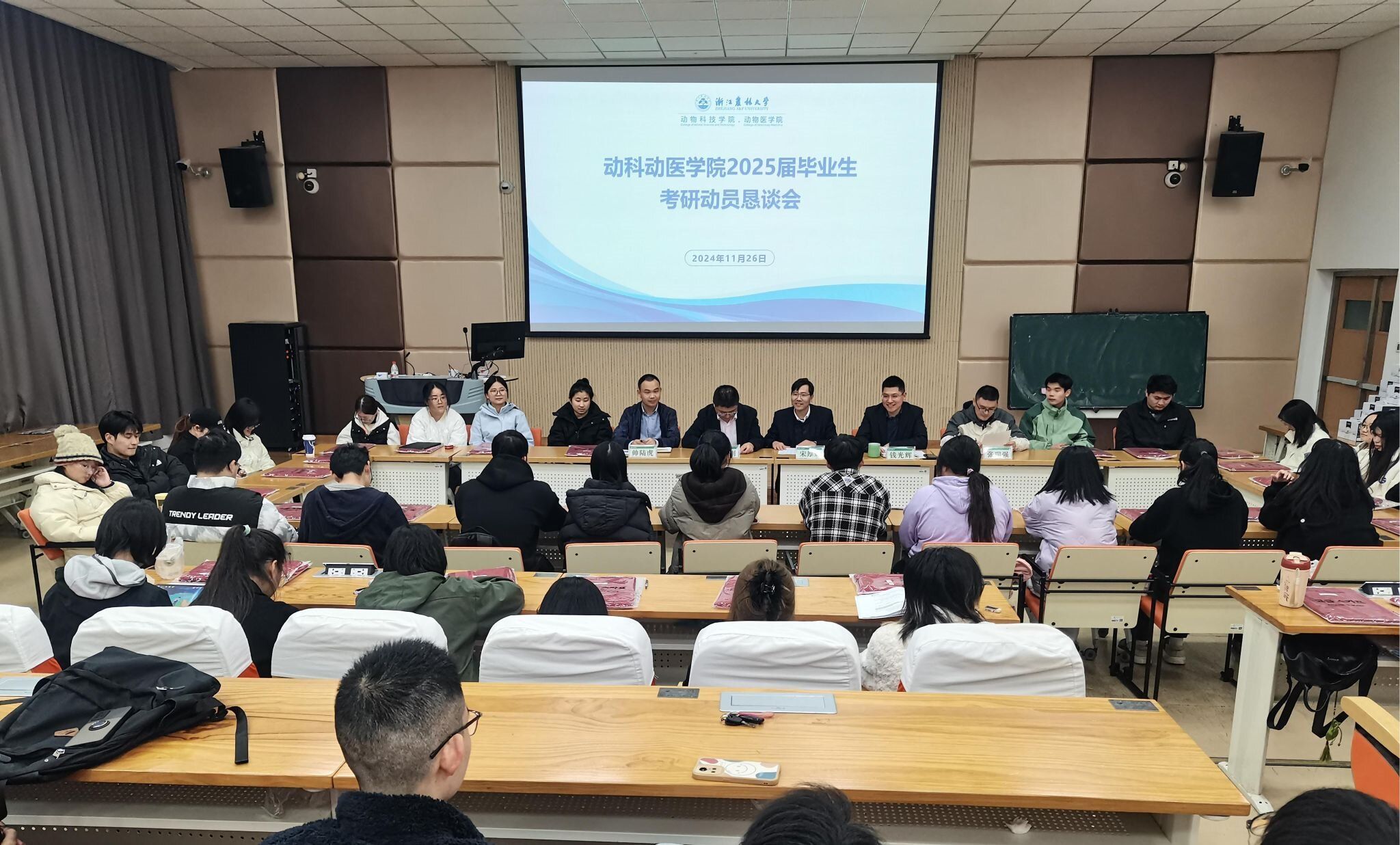 11月26日,动科动医学院召开2025届毕业生考研动员恳谈会。校党委委员、动科动医学院院长宋厚辉、动科动医学院党委、学科相关负责人及2025届考研学生参加活动。