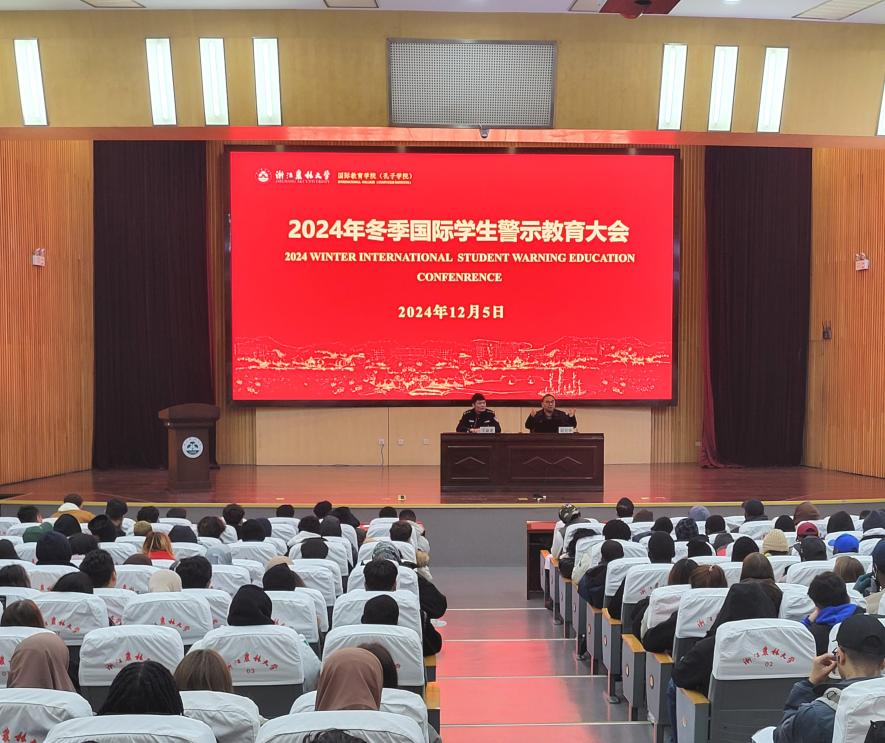 12月5日,国教学院举行冬季国际学生警示教育大会,邀请杭州市公安局临安区分局警官参加并做案例警示讲座。会议由院长赵有华主持,学院相关负责人、全体辅导员及国际学生参加了此次会议。