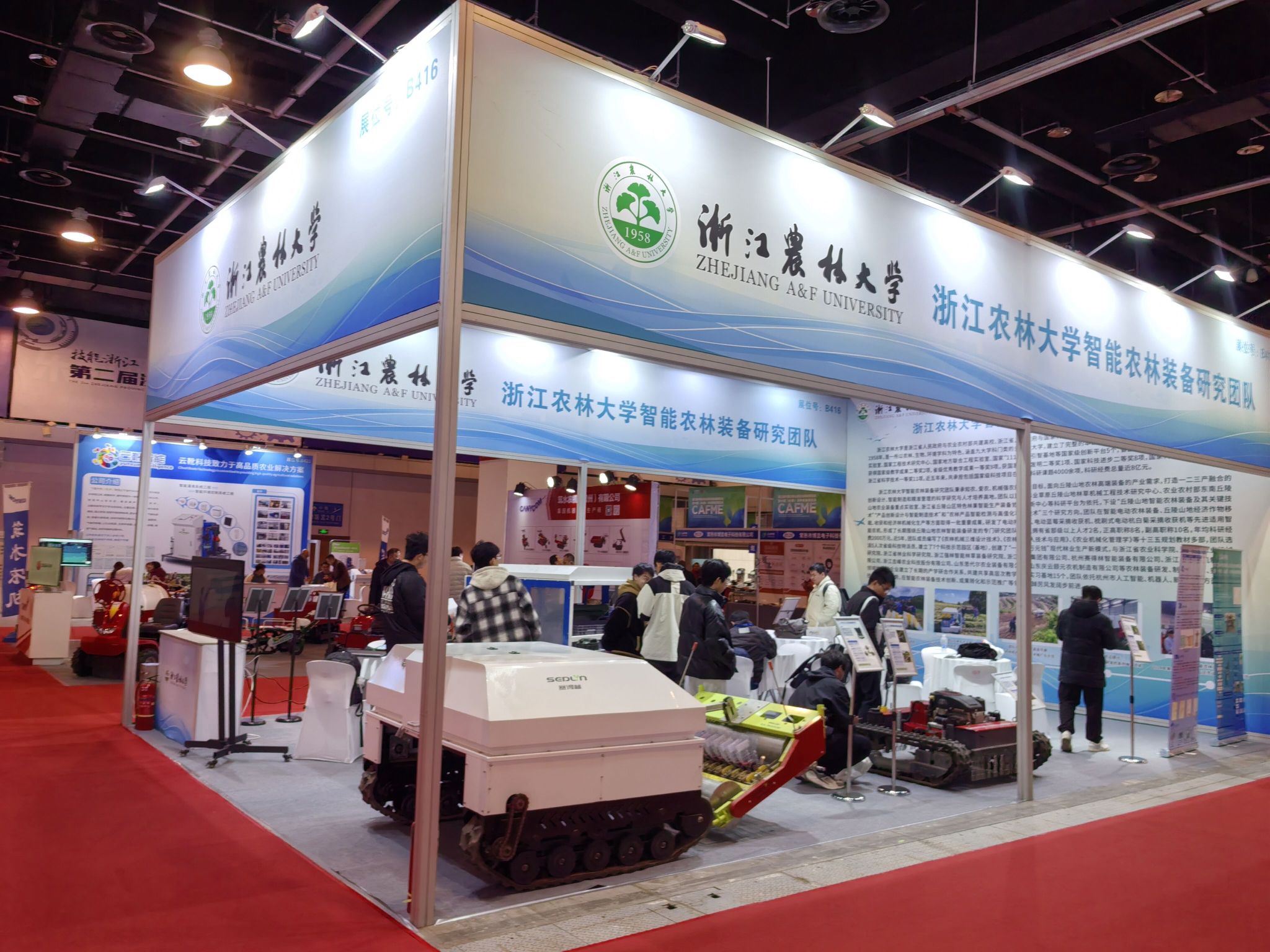 3月6日,以“绿色智慧 科技互联”为主题的第三届中国丘陵山区农业机械博览会暨中国(永康)农林装备博览会在浙江永康国际博览中心开幕。beat365官网智能农林装备研究团队携多款电动智能装备、智慧农业整体解决方案及科研样机展板精彩亮相,全面展示了beat365官网农业工程/机械工程学科在助力农业“双强”行动中的创新成果与产学研推实践探索。