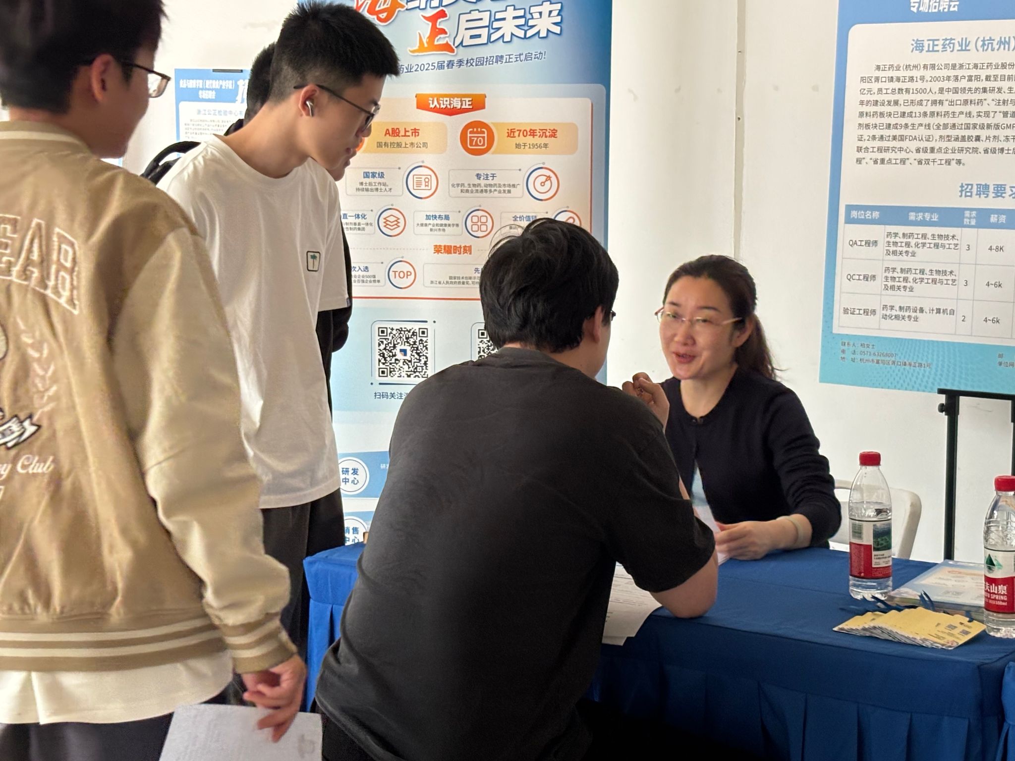 据统计,本次招聘会汇聚包括海正药业、公正检测在内的10家企业,携岗入校释放30余个精准岗位,吸引近200名学子到场求职。在供需双方的双向奔赴中,已有数十名毕业生与心仪企业达成了初步就业意向。