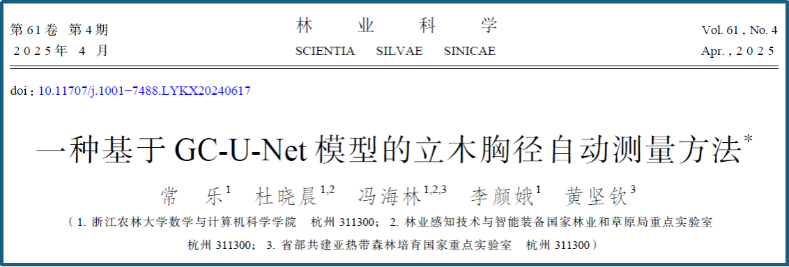 近日,数计学院冯海林教授团队的学术论文“一种基于GC-U-Net模型的立木胸径自动测量方法”一文在《林业科学》2025年第4期以封面论文发表。《林业科学》是林草科技领军期刊,入选中国科技期刊卓越行动计划,也是目前唯一被EI收录的中文林业科技期刊。该论文第一作者为数计学院22级农业信息化研究生常乐,通讯作者为冯海林教授。beat365官方网站数学与计算机科学学院为该论文第一单位和通讯作者单位。