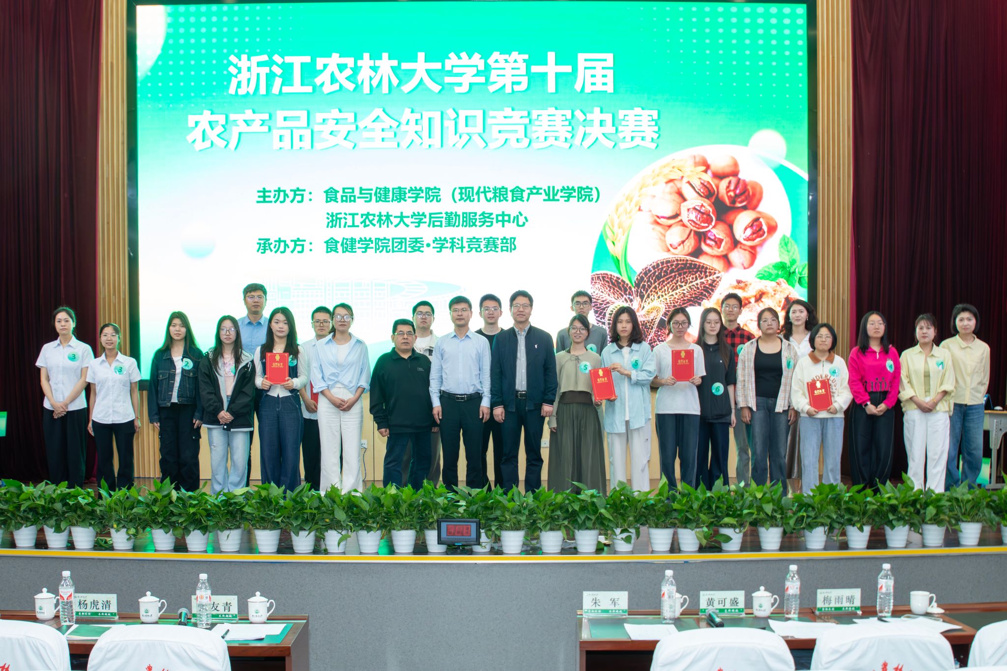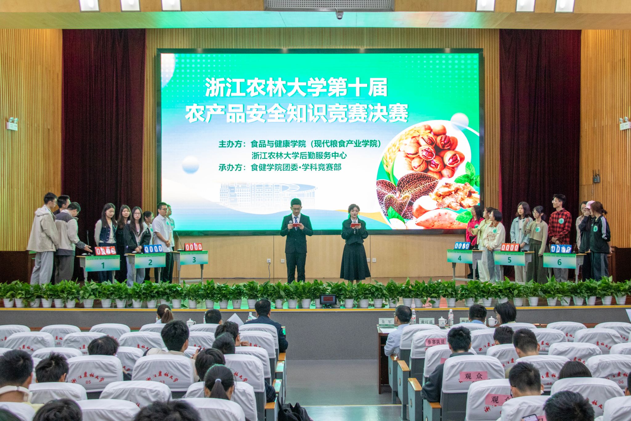 4月19日上午,beat365官方网站第十届农产品安全知识竞赛决赛在图书馆第一报告厅成功举办。临安区市场监督管理局党委委员、总工程师张友青,食健学院食品学科教授杨虎清,后勤服务中心餐饮服务部相关负责人担任评委。学院党委负责人、学生工作负责人、学生办主任出席本次决赛。