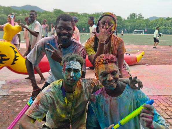活动现场舞台上,各国留学生通过歌舞表演,向观众展现多元文化的独特魅力。体育竞技环节,足球赛高潮迭起,展现团队协作与体育精神;趣味挑战赛则包含合力建塔、鼓动人心、三人四足等项目,留学生通过协作通关,体验中国传统文化中的“团结”智慧。学生们身着白色T恤,在动感音乐中用食用干粉颜料泼洒嬉戏,奔跑间绘出斑斓色彩,水花四溅、欢声笑语,中外师生共同沉浸于欢乐氛围中。