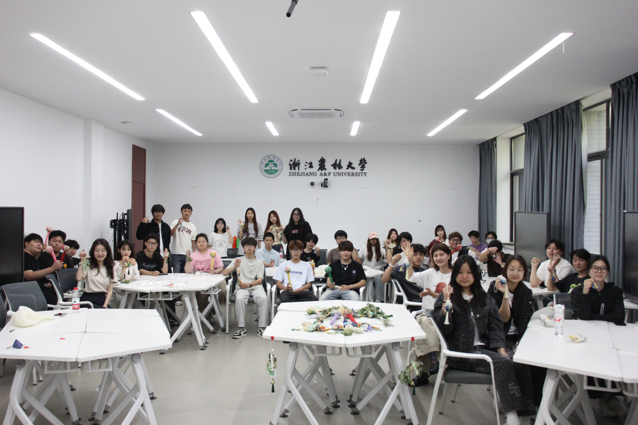 在最引人注目的艾草香囊制作区,同学们将莲蓬、柿子、苹果、梨子等造型别致的香囊布片整齐陈列,全神贯注地穿针引线、精心缝合,让阵阵清幽药香在教室中弥漫开来,寄托着学子们对平安健康的美好祈愿。