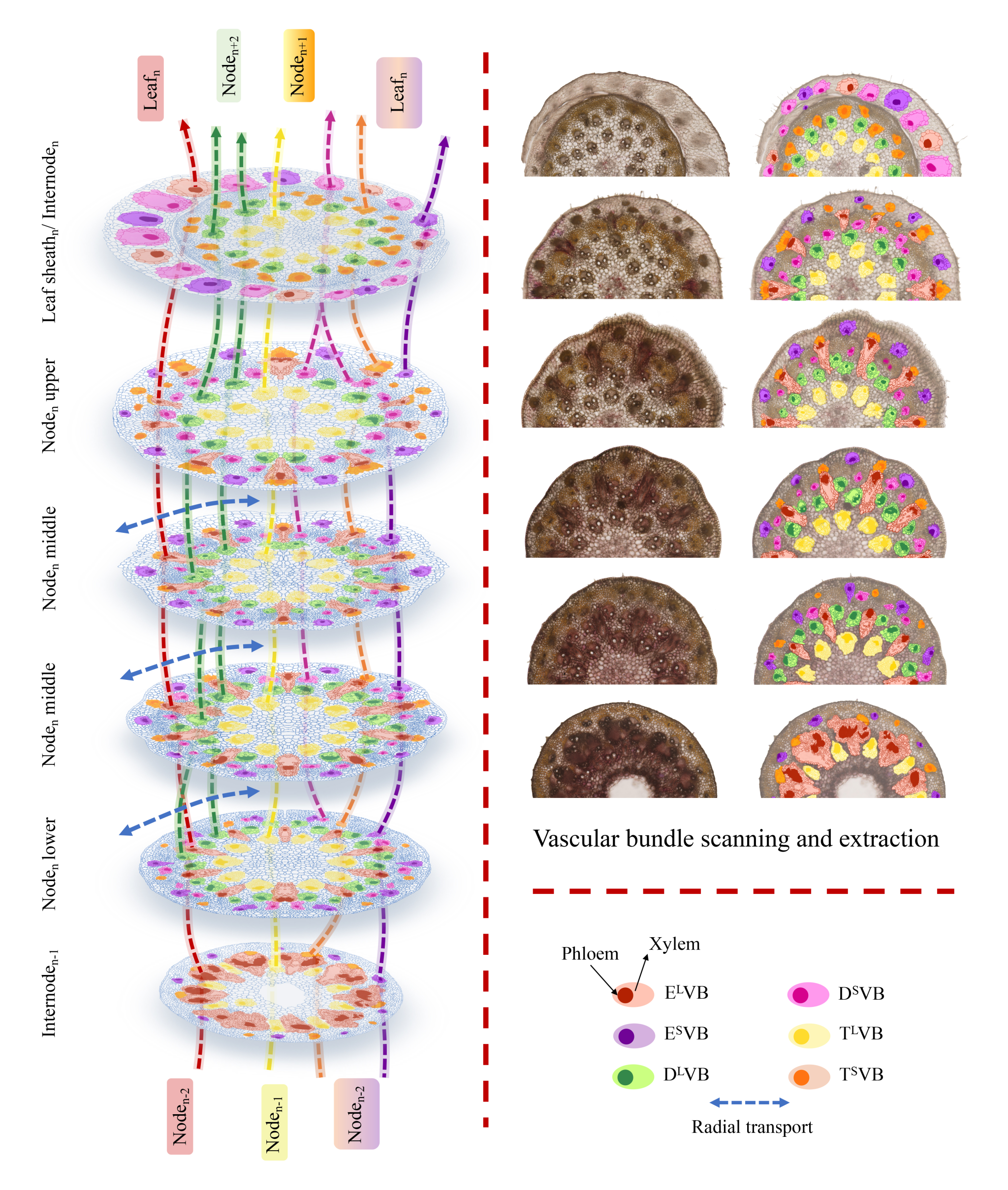 竹类植物有许多鲜明的生物学特征,其中竹节,就是竹类植物的一个显著特征。根据节生长部位的不同,竹节可以分为三种类型:茎秆节、笋芽节和竹鞭节。这些不同部位的竹节在结构和功能上有什么区别和功能?在过去的几十年里,人们对竹子中节的功能特性进行了广泛研究,包括物理和机械属性、力学性能、结构组成等。然而,这些研究主要集中在茎秆内的节区,忽略了节区的整体性,其中包括枝、叶、根的存在。节在竹类植物中不仅是节间的连接点,同时也是叶、枝、分蘖芽和根的连接点。本研究以毛竹实生苗为研究材料,可视化茎秆、笋芽和竹鞭节点的维管束结构(图1)。