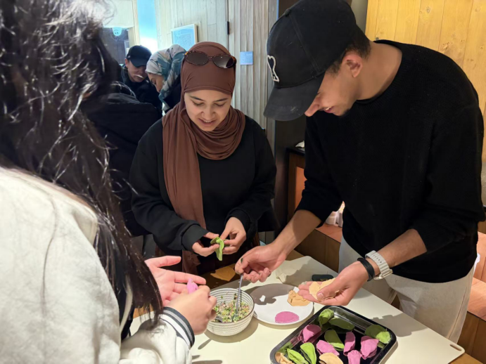 在后花园的千年古树下,同学们纷纷挂上祈福牌,将对学业、家人及未来的美好祝愿寄语青山绿水。留学生们学习了五彩水饺的制作,从擀皮到包馅,五彩斑斓的水饺象征着多元文化的交融。师生们还体验了地方特色美食——牛蒡粿的制作技艺,感受地道的“乡土味道”。在书房茶室,一场红茶生活茶艺展示让师生们静心凝神,深度领略了中国茶文化的雅致。