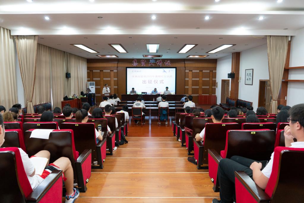 出征仪式上,主席台领导为指导老师颁发了聘书,为新工科、新农科、新文科求真实验班暑期社会实践团授旗。新工科求真实验班181班蓝家豪作为学生代表发言。